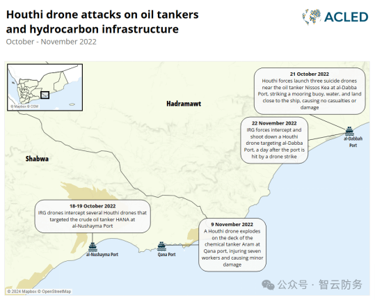 作为回应,胡塞武装决定限制 IRG 的财政收入来源。在向国内外公司发出多次警告后,他们颁布了碳氢化合物出口禁令,并于 2022 年 10 月和 11 月对也门南部省份沙布瓦省和哈德拉毛省的油轮和基础设施发动了一系列无人机袭击来执行这一决定(见下图).尽管数量有限且造成的损失可以忽略不计,但这些攻击成功地阻止了 IRG 的碳氢化合物出口,在 10 个月内造成了估计超过 10 亿美元的损失。